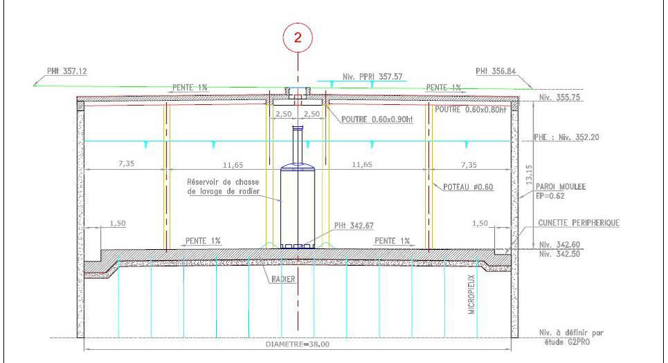 Dans le cadre du projet de construction d’un bassin d’orage sur le secteur des Sauzes, CLERMONT COMMUNAUTE a confié à Géotec une mission d’investigations géotechniques complémentaires puis d’étude géotechnique de conception G2-PRO. L’opération consiste en la construction d’un ouvrage de 38 m de diamètre et de 15 m de profondeur. Le projet est complété par une chambre d’interception. Le site s’inscrit dans un environnement alluvionnaire masquant le substratum Oligocène local. La nappe se situe vers 3.0 m de profondeur.